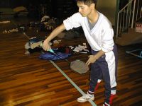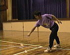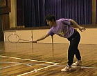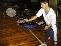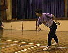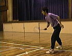 2.左手を離し、ねじれを解放します。そのとき、ねじれがもどる力のみでシャトルをヒットします。肩は動かさないように。
