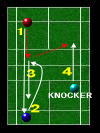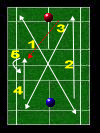 右の図のように、青の方は、赤丸のどちらかに打ちます。赤の方は、ネット前の球に対しては、必ずストレートネットで返球するという条件を設定し、後ろの球は1から4の順に打ち分けていきます。逆の移動方向も行います。