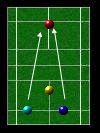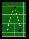 図 のように1の方は2人いるほうのコートへ返球しますが、前衛の前へ7割、後衛へ3割という割合で打ちます。前衛には目の前に返球するので速いタッチのリ ターンがあります。タイミングをずらされ追い込まれることでしょう。しかし、その返球を相手のラケットの面や態勢などを冷静に見極め、「ドライブ」で前衛 を抜きます。または後衛の待っていない方向へ「ロビング」で攻めたりもします。2の方の前衛は決めてしまうのではなく1を劣勢にするのが目的なので「何と かつなげることができる」球出しをします。