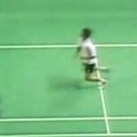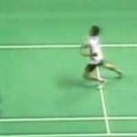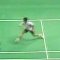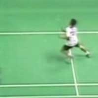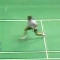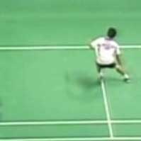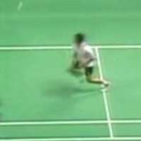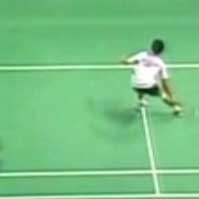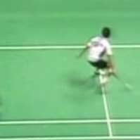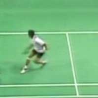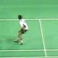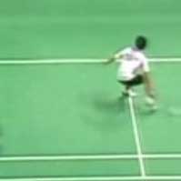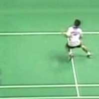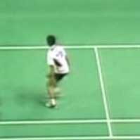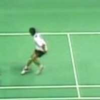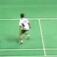 フットワーク フットワーク例/バックハンド側奥(ハイバック) 2012年9月30日 2020年1月14日 Keiichi Arita 速いタイミングでのハイバックショットです。上半身のバランスを脊柱の軸回転により見事に維持しています。左肘の動きに特に注目してください。 すばやく腰を沈め後方に重心を移し左肘を後ろに引きながら脊柱の軸回転を行う 右足をシャトル方向に正確に出しインパクト 右膝は約135度を維持し右足だけで踏ん張るのではなく 後ろ方向への移動力を軸回転によりバランスの維持に利用 スポンサーリンク Facebook post