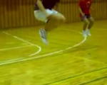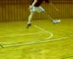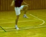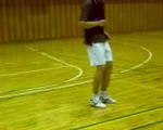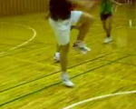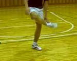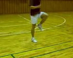 | 三角を描くように3点跳びです。 | 膝を屈伸させてからのジャンプです。 | ジャンプで体をねじり右、左足を交互に前に出します。 |